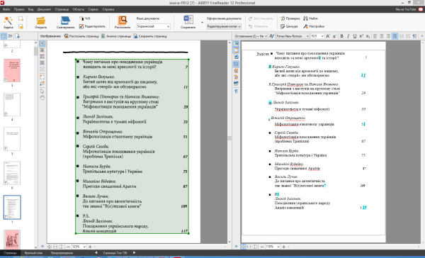 В отличие от прежней версии, также не происходит перелистывания страниц по мере распознавания или при начальной загрузке документа, если автоматическое распознавание отключено. В Abbyy FineReader 12 Professional документ загружается и разбивается на страницы практически мгновенно, а их эскизы строятся только по мере ручного пролистывания в левой панели. Кроме всего прочего, тем самым экономятся вычислительные ресурсы, причем, довольно ощутимо на больших многостраничных документах.