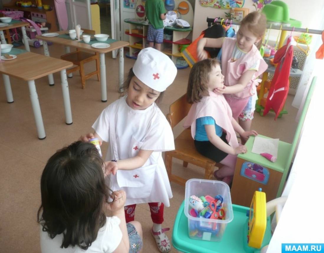 Врач: шапочка с красным крестиком, халат, атрибуты (трубка, шприц, градусник, бутылочка из-под лекарств, баночки из-под мазей с палочкой, пипетка, вата, бинт, горчичники — прямоугольные кусочки медицинской клеенки, таблетки, нарисованные на кусочках картона).
